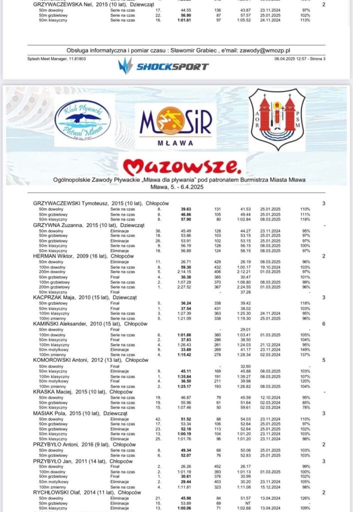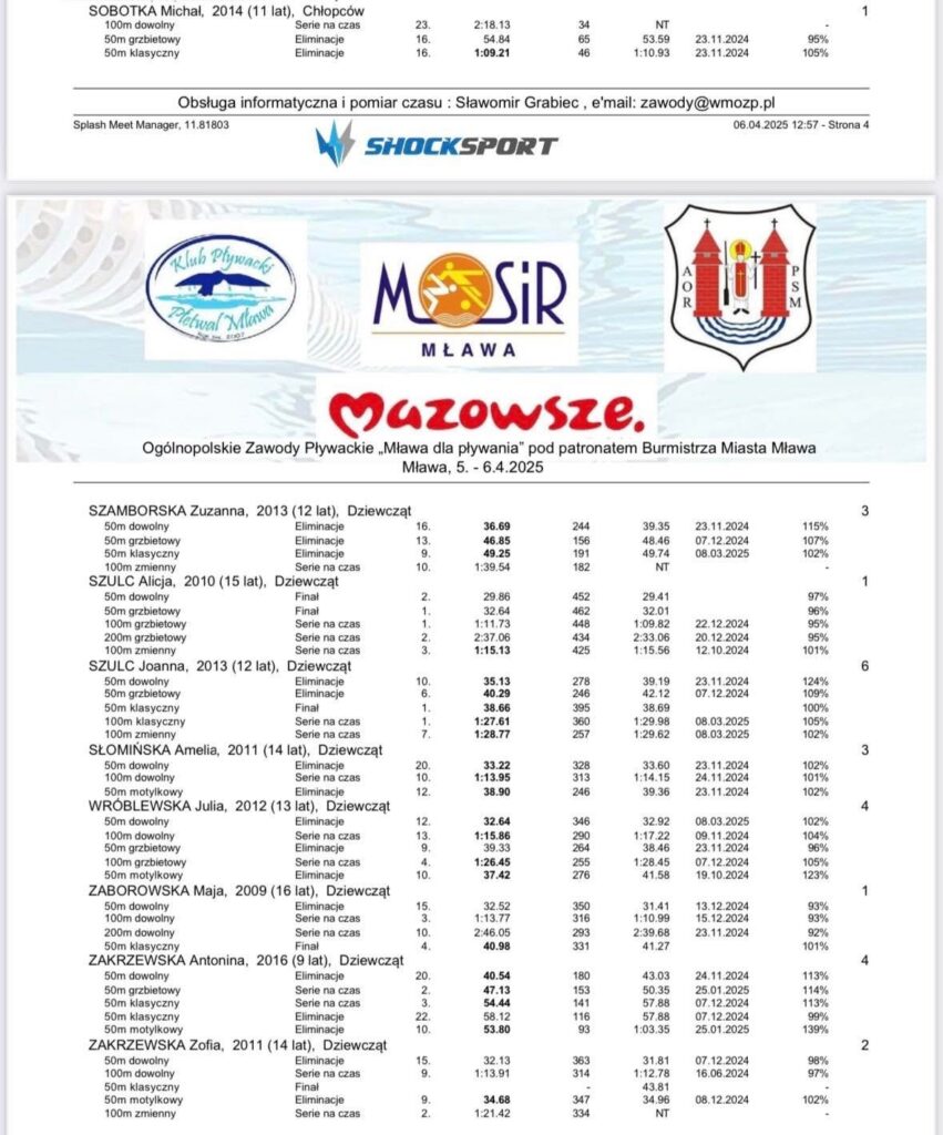 Rywalizacja była zacięta, a poziom zawodów – imponujący. Na mławskiej pływalni padło wiele rekordów życiowych oraz rekordy meetingu, co tylko potwierdza, że uczestnicy przyjechali w znakomitej dyspozycji. Każdy wyścig to była walka do ostatnich metrów – pełna emocji, zaangażowania i sportowej walki na najwyższym poziomie.