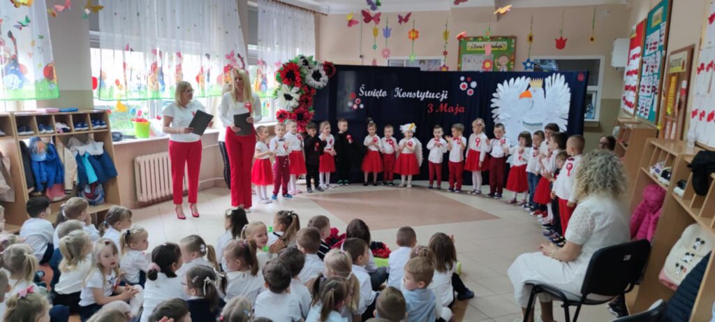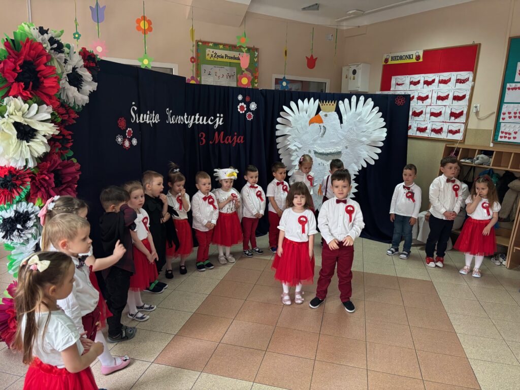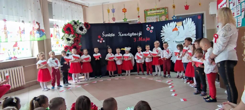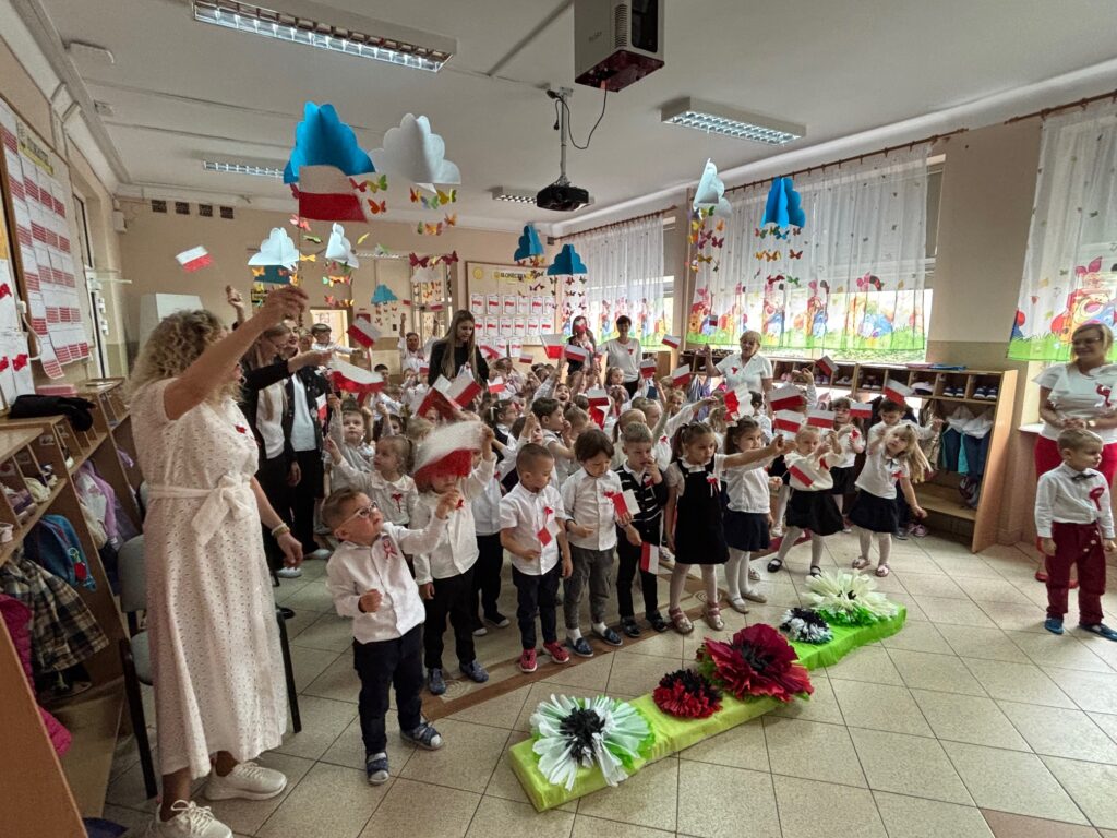 Grupa „Krasnali” zaprezentowała się tego dnia w niezwykle uroczy sposób — przedszkolaki ubrane w biało-czerwone stroje z dumą reprezentowały barwy narodowe, podkreślając znaczenie naszych najważniejszych symboli: Godła, Flagi, Hymnu oraz samej Ojczyzny. Uroczystość rozpoczęła się od wspólnego odśpiewania „Mazurka Dąbrowskiego”, w którym mimo młodego wieku dzieci wzięły udział z dużą powagą i zaangażowaniem.