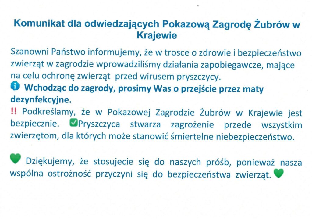 Nadleśnictwo Dwukoły wydało ważny komunikat dla osób odwiedzających Pokazową Zagrodę Żubrów na Krajewie w Mławie. W związku z zagrożeniem pryszczycą wprowadzone zostały specjalne środki ostrożności mające na celu ochronę zwierząt.