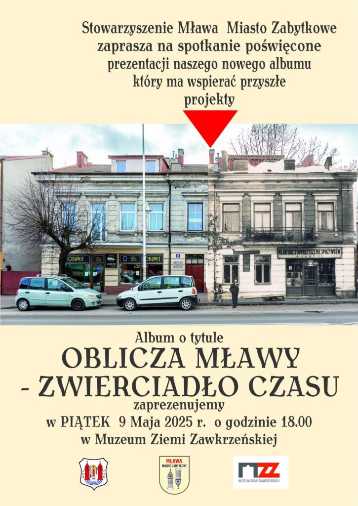 Stowarzyszenie Mława Miasto Zabytkowe zaprasza wszystkich miłośników historii, architektury i dziedzictwa kulturowego na szczególne wydarzenie. W piątek, 9 maja 2025 roku o godzinie 18:00 w Muzeum Ziemi Zawkrzeńskiej odbędzie się premiera nowego albumu zatytułowanego „Oblicza Mławy – Zwierciadło Czasu”.