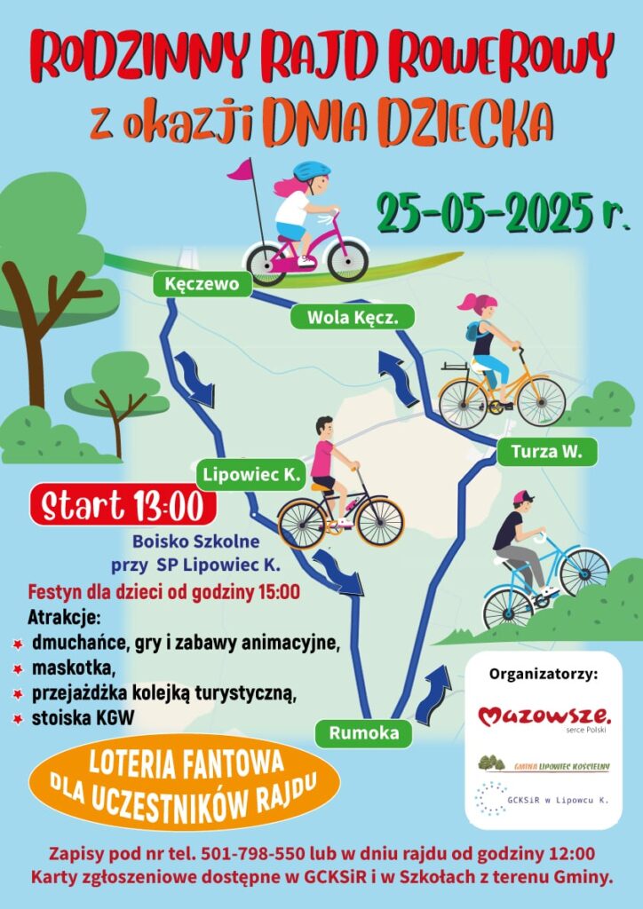 Już 25 maja 2025 r. Wójt Gminy Lipowiec Kościelny oraz GCKSiR w Lipowcu Kościelnym zapraszają wszystkich miłośników aktywnego wypoczynku na wyjątkowy Rodzinny Rajd Rowerowy z okazji dnia dziecka, który skierowany jest do dzieci, młodzieży oraz dorosłych. To doskonała okazja, by spędzić czas na świeżym powietrzu, poznać uroki naszej gminy i wziąć udział w integracyjnej przygodzie pełnej pozytywnej energii.