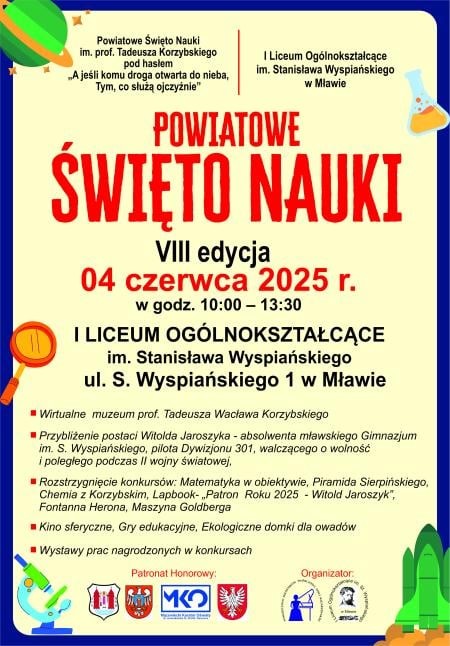 Już po raz ósmy Mława stanie się centrum naukowej inspiracji i edukacyjnej zabawy. W środę, 4 czerwca 2025 roku, odbędzie się Święto Nauki im. prof. Tadeusza Korzybskiego pod hasłem: „A jeśli komu droga otwarta do nieba, Tym, co służą ojczyźnie”.