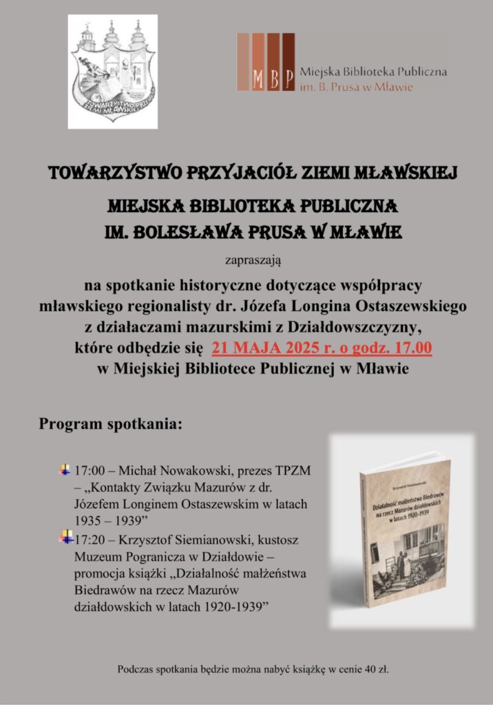 Miejska Biblioteka Publiczna im. Bolesława Prusa w Mławie oraz Towarzystwo Przyjaciół Ziemi Mławskiej serdecznie zapraszają mieszkańców na wyjątkowe spotkanie historyczne, które odbędzie się w środę, 21 maja o godz. 17:00 w siedzibie biblioteki.