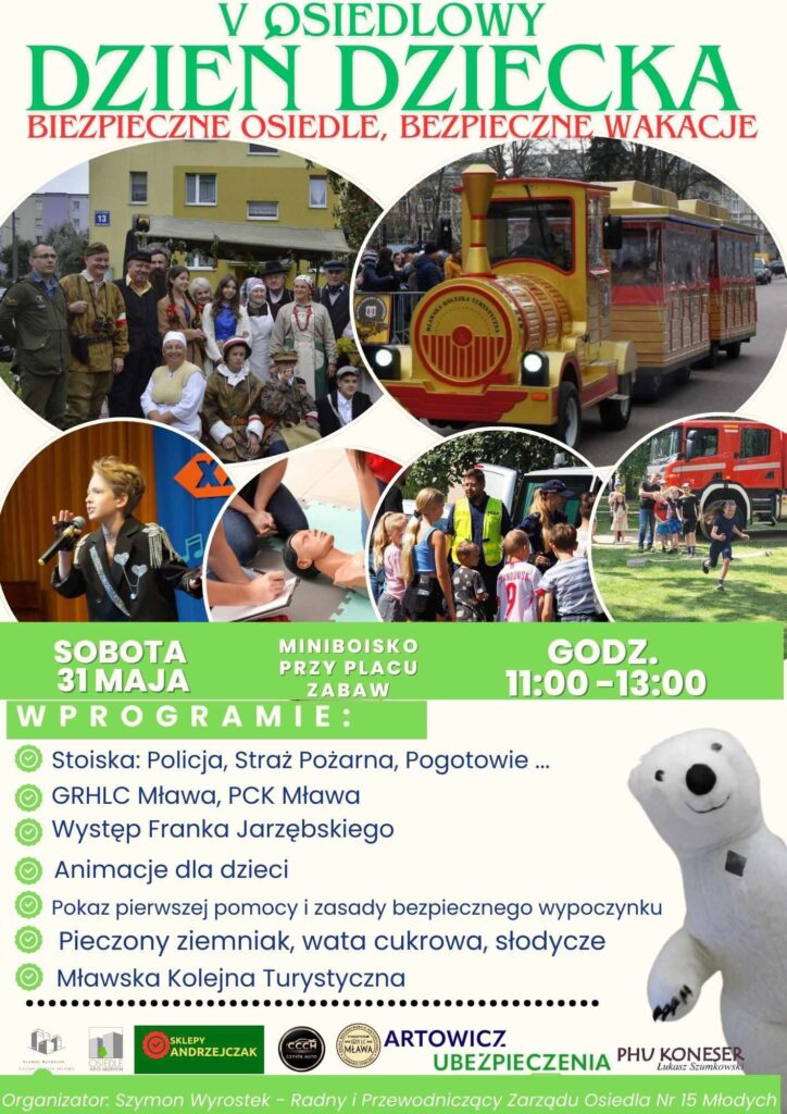 Już w sobotę, 31 maja w godzinach 11:00–13:00, Osiedle Młodych w Mławie zamieni się w prawdziwą krainę dziecięcej radości i edukacji pod hasłem „Bezpieczne Osiedle – Bezpieczne Wakacje”. To już piąta edycja Osiedlowego Dnia Dziecka, który z roku na rok cieszy się coraz większym zainteresowaniem mieszkańców.