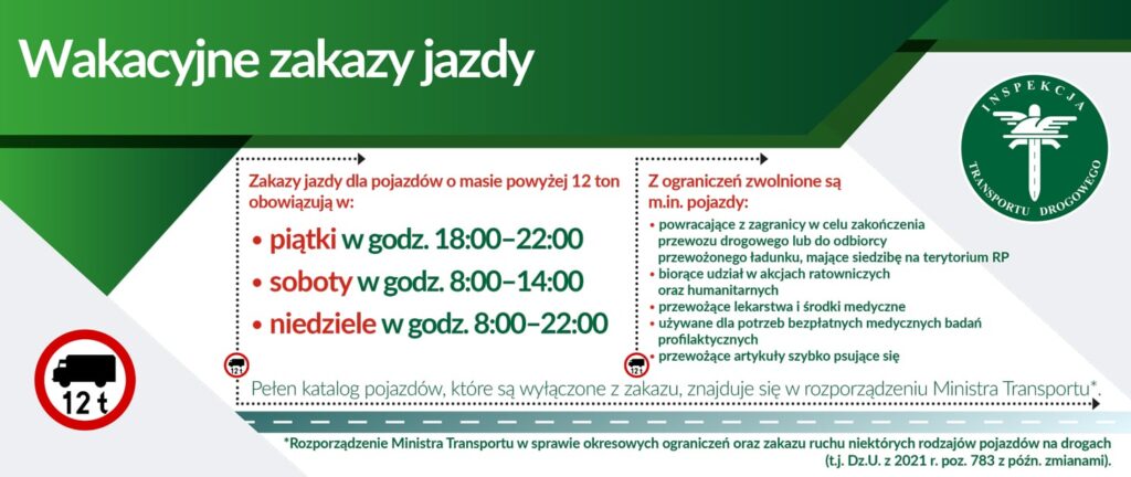 Szczegółowy wykaz pojazdów zwolnionych z zakazów znajduje się w rozporządzeniu Ministra Transportu w sprawie okresowych ograniczeń oraz zakazu ruchu niektórych rodzajów pojazdów na drogach (Dz.U. z 2021 r., poz. 783 z późn. zmianami).
