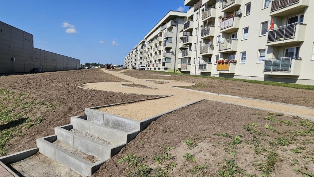 Równolegle powstają ciągi piesze z mineralnej mieszanki wodoprzepuszczalnej. Zgodnie z projektem, inwestycja obejmuje nie tylko strefę dla dzieci, ale także udogodnienia dla dorosłych, m.in. siłownię plenerową, elementy małej architektury i tereny zielone.