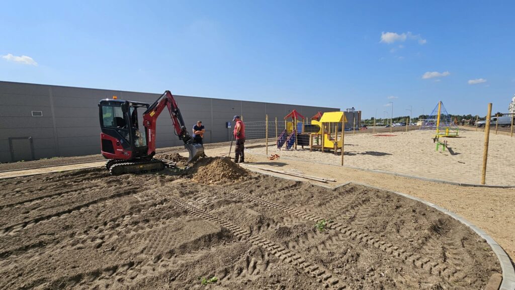 Teren został już oczyszczony i przygotowany, a obecnie trwają prace związane z wykonaniem nawierzchni. Pierwsze efekty widać gołym okiem – na placu zabaw zamontowano linarium, zestaw dla najmłodszych oraz karuzelę. Wkrótce pojawią się kolejne atrakcje.