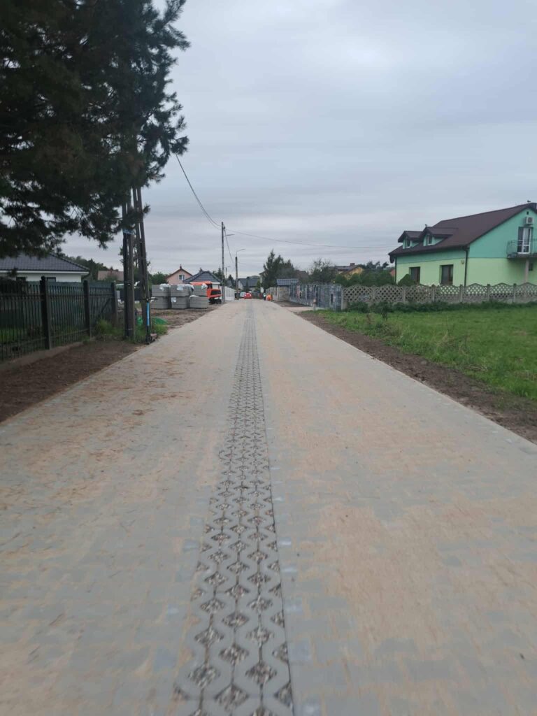 W ramach inwestycji dotychczasowa nawierzchnia zostaje wymieniona na kostkę betonową z pasami z ażurowych płyt betonowych. To jednak nie wszystko – powstaje także nowoczesny system drenażu ze skrzynkami rozsączającymi, który umożliwi wsiąkanie wód opadowych bezpośrednio do gruntu. Rozwiązanie to pozwoli ograniczyć spływ powierzchniowy, co przełoży się na lepsze gospodarowanie wodami deszczowymi, większe bezpieczeństwo oraz wyższy komfort życia mieszkańców.