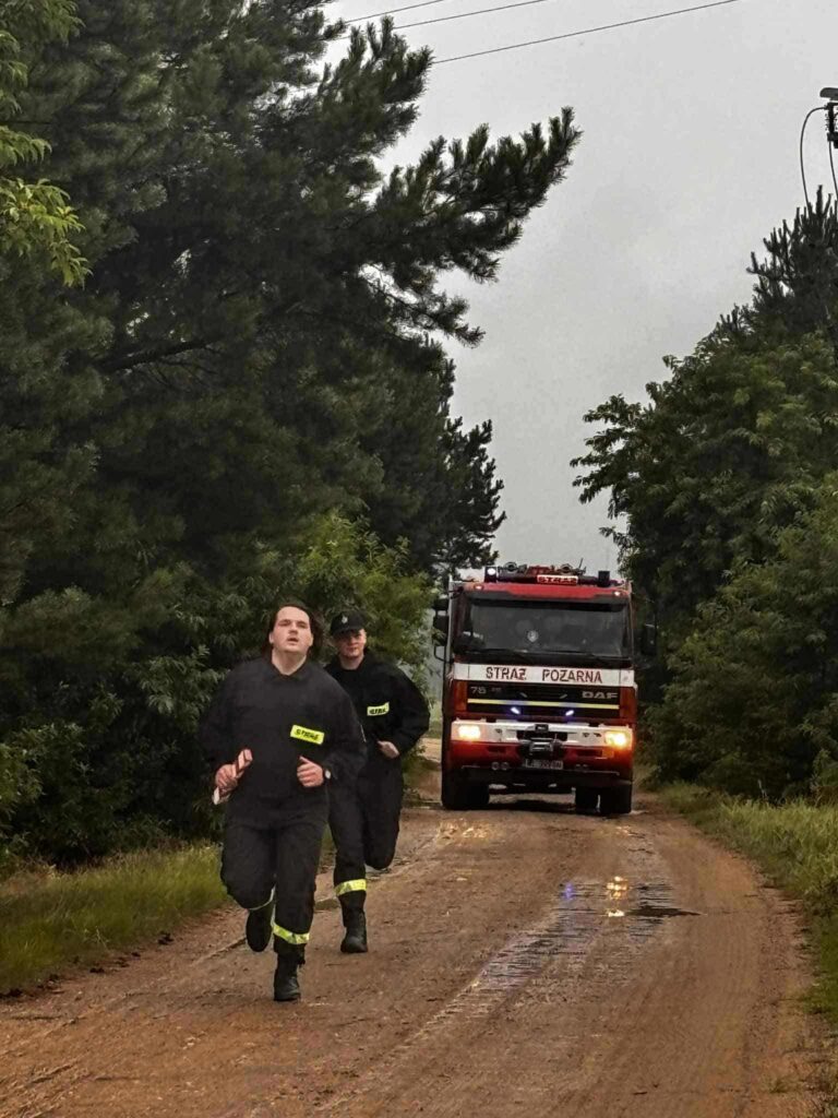 Drugi etap rozpoczął się w Janowie. Druhowie OSP, mimo deszczu i trudnych warunków, nieśli dalej pałeczkę.