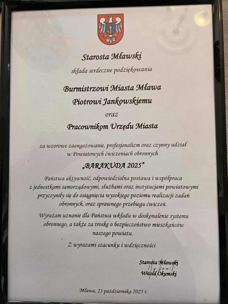 W ćwiczeniach uczestniczył Zastępca Burmistrza Miasta Mława – Mariusz Szczechowicz, reprezentujący mławski samorząd. Na jego ręce Starosta Mławski przekazał podziękowania za wzorowe zaangażowanie, profesjonalizm oraz czynny udział w Powiatowych Ćwiczeniach Obronnych „BARAKUDA – 2025”.