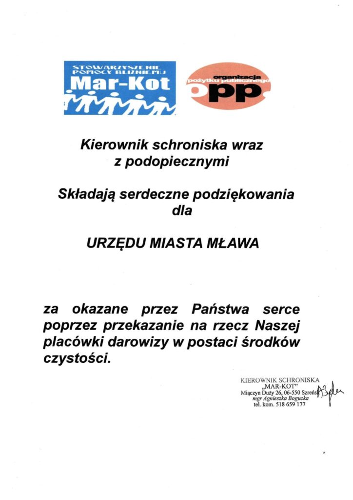 Jak co roku o tej porze, do Schroniska MAR-KOT w Miączynie Dużym trafiły środki czystości i higieny osobistej – produkty, na które w okresie zimowym zapotrzebowanie jest szczególnie duże. Zebrane dary przekazali dla podopiecznych Schroniska Stowarzyszenia Pomocy Bliźniemu MAR-KOT Zastępca Burmistrza Miasta Mława Marcin Burchacki oraz Andrzej Fafiński – Inspektor Zarządzania Kryzysowego, Spraw Obronnych i Obrony Cywilnej.