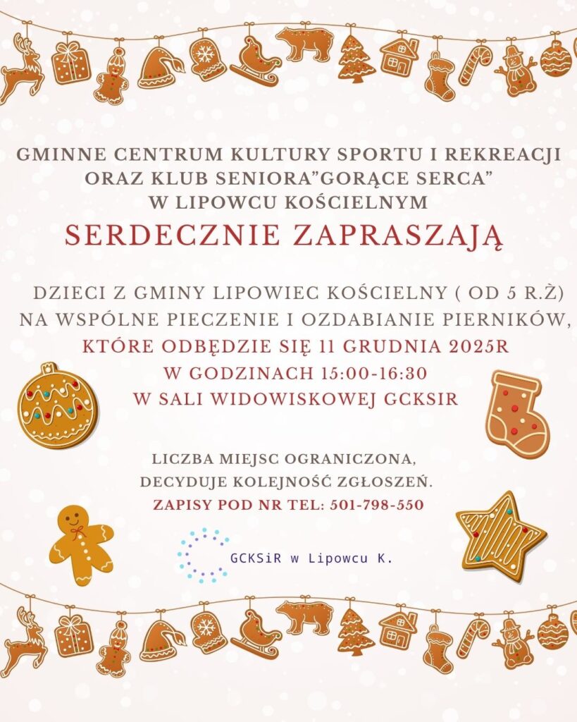 11 grudnia 2025 r. w godzinach 15:00–16:30 w sali widowiskowej GCKSiR odbędą się warsztaty wspólnego pieczenia i ozdabiania pierników. To wydarzenie przygotowane z myślą o dzieciach z Gminy Lipowiec Kościelny w wieku od 5 lat, które chcą poczuć atmosferę nadchodzących świąt i spędzić czas w twórczy, radosny sposób.