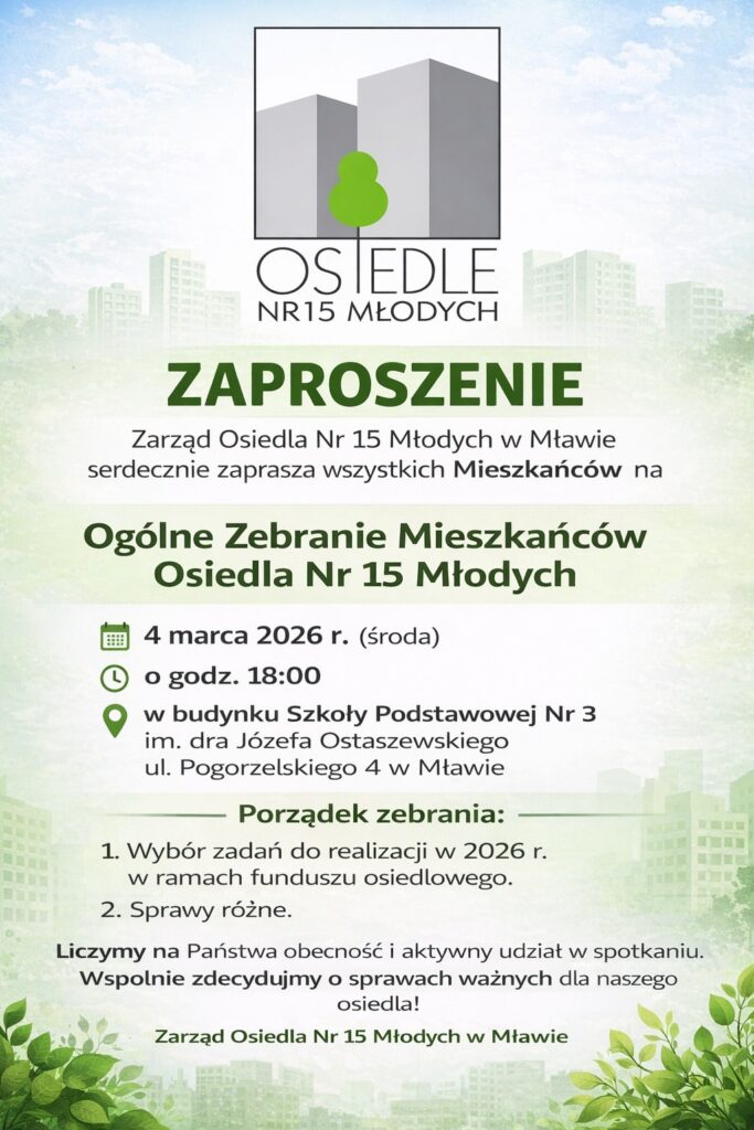 Zarząd Osiedla Nr 15 Młodych w Mławie zaprasza mieszkańców na ogólne zebranie osiedla, które odbędzie się w środę, 4 marca 2026 roku o godz. 18:00 w budynku Szkoły Podstawowej Nr 3 im. dra Józefa Ostaszewskiego przy ul. Pogorzelskiego 4.