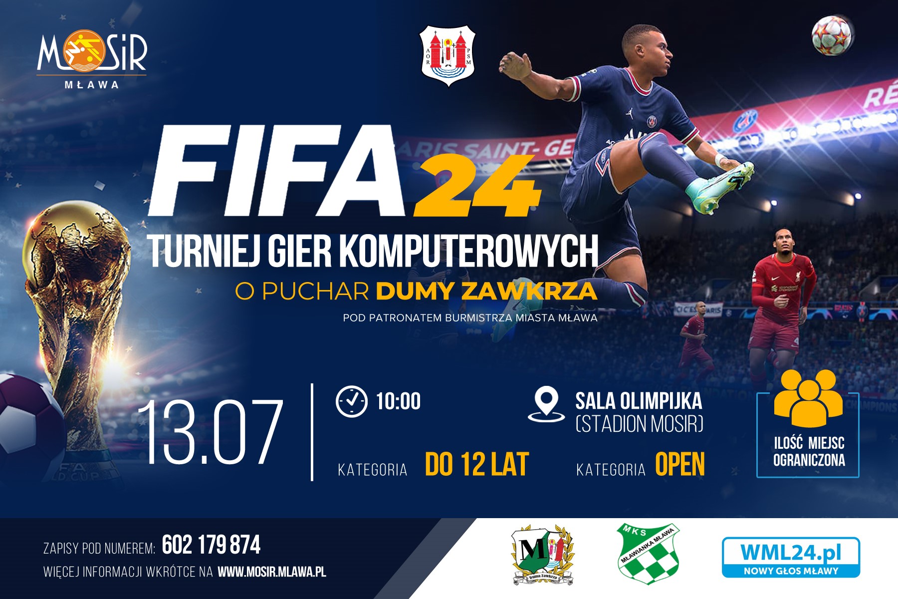 Miejski Ośrodek Sportu i Rekreacji w Mławie zaprasza na turniej w FIFA 2024, o nazwie “PUCHAR DUMY ZAWKRZA”. Jest to turniej esportowy, dla wszystkich sympatyków Mławianki Mława. Jest to impreza bezpośrednio powiązana z obchodami Dni Mławy.