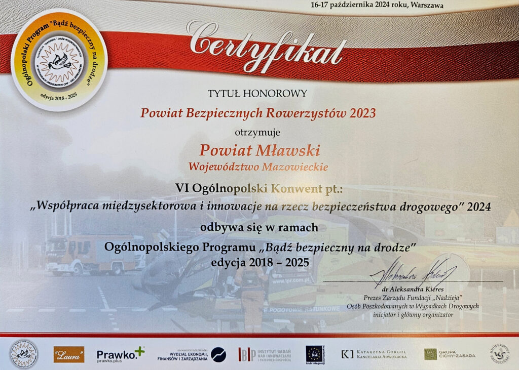 Podczas VI Ogólnopolskiego Konwentu „Współpraca międzysektorowa i innowacje na rzecz bezpieczeństwa drogowego”, który odbył się 16 października br., w Warszawie, Starosta Mławski oraz Komendant Powiatowy Policji w Mławie insp. Artur Ryfiński, odebrali z rąk organizatorów wyjątkową w skali kraju nagrodę za zaangażowanie na rzecz bezpieczeństwa w ruchu drogowym. Powiat mławski zdobył tytuł honorowy „Powiat bezpiecznych rowerzystów 2023”.