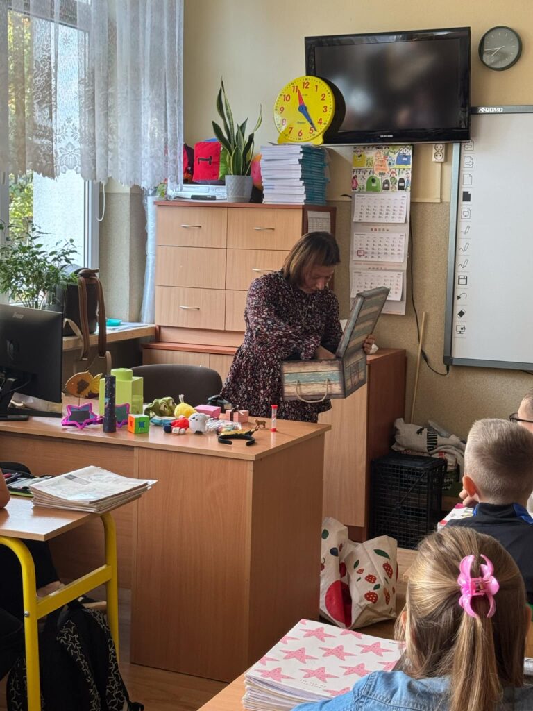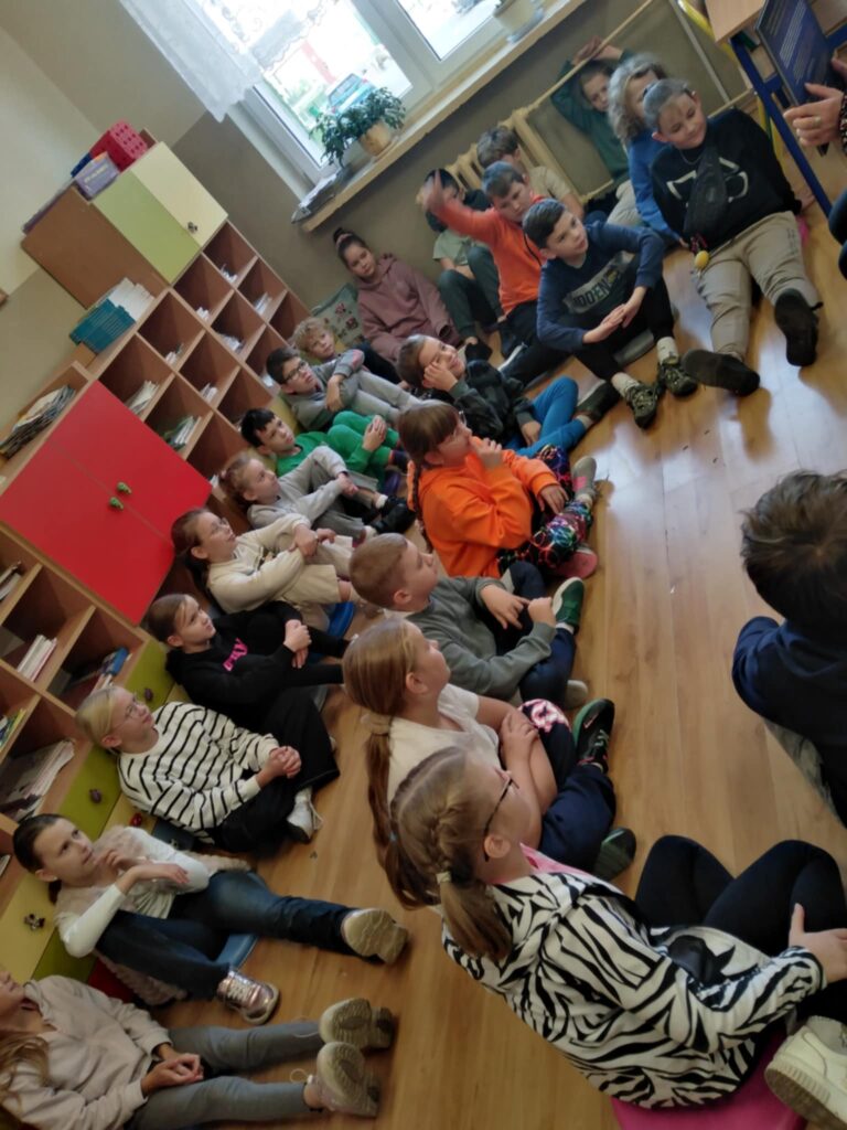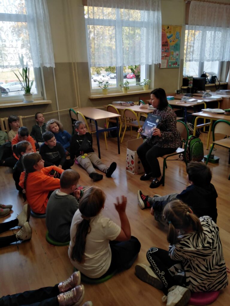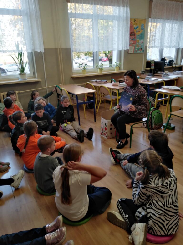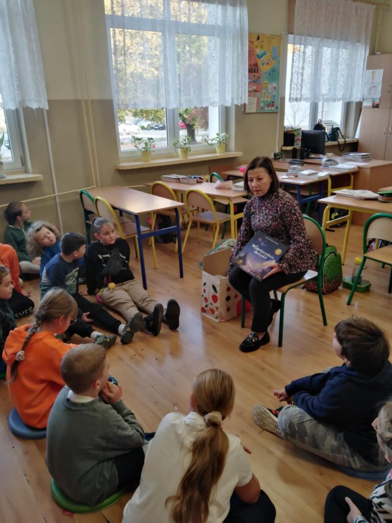 Uczniów odwiedziła pani Bogumiła Pawłowska z Biblioteki Pedagogicznej w Mławie. Podczas zajęć pani Bogumiła przeczytała dzieciom książkę pt.: „Wypożyczalnia skrzydeł” – jest to opowieść o magii czytania. Następnie dzieci brały udział w zabawach, a na koniec wykonały zakładki do książek.