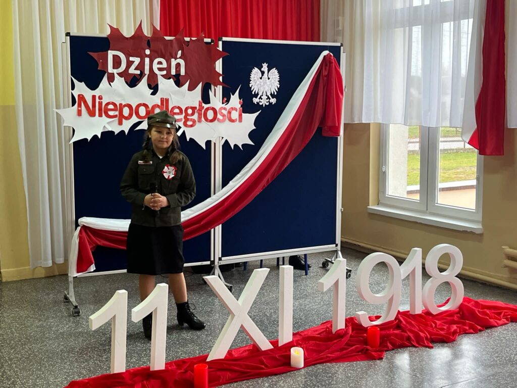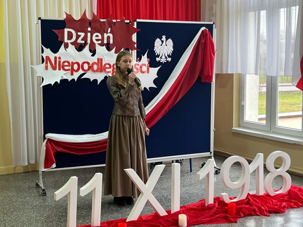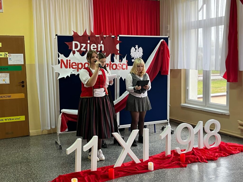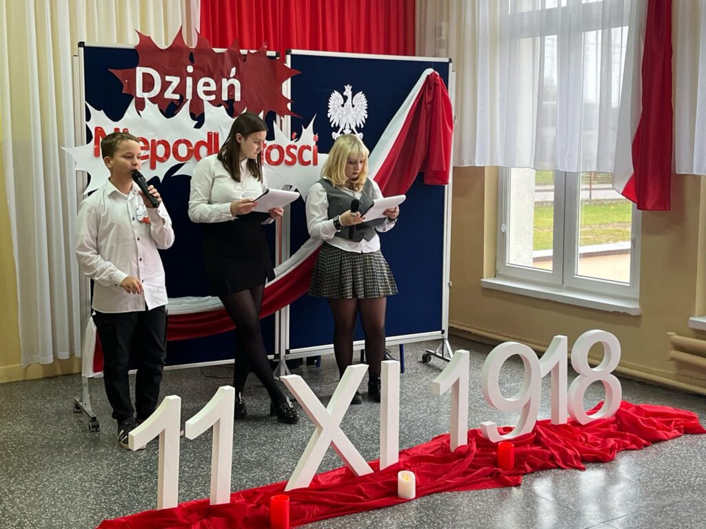 Następnie na scenie pojawili się uczniowie z klasy szóstej i ósmej. Zaprezentowali program artystyczny, w którym przypomnieli najważniejsze wydarzenia związane z odzyskaniem przez Polskę Niepodległości. Ich występ wzbogacony był fragmentami poezji oraz patriotycznymi akcentami.
