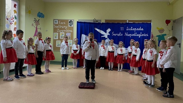 Co roku 11 listopada obchodzimy w Polsce Narodowe Święto Niepodległości. Już u takich małych dzieci, trzeba rozbudzać zainteresowanie swoją Ojczyzną i kształtować poczucie dumy z przynależności do Narodu Polskiego. Dlatego też w Miejskim Przedszkolu Samorządowym nr 4 przy ul. Krasińskiego grupa 6- latków Kotki przygotowała uroczystą inscenizację z okazji Odzyskania Niepodległości.