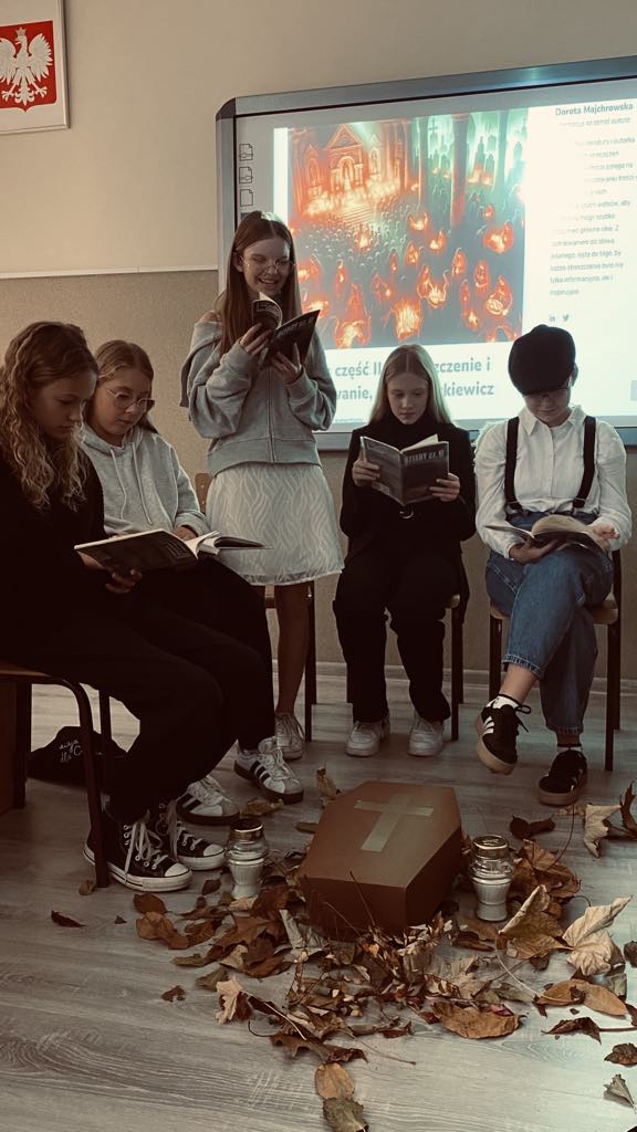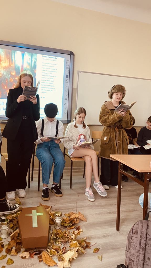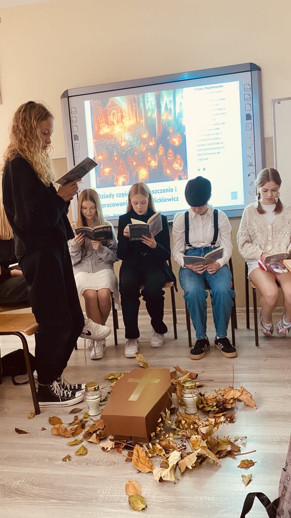 W ramach zajęć z języka polskiego, uczniowie klasy 7 a Szkoły Podstawowej nr 3 w Mławie, mieli okazję wziąć udział w wyjątkowej inscenizacji fragmentu dramatu “Dziady cz. II” Adama Mickiewicza. Była to doskonała okazja, by lepiej zrozumieć tę niezwykle symboliczną lekturę i zaangażować się w twórczy sposób w analizę dzieła. Uczniowie wcielili się w postacie dramatu, a przy odpowiednich rekwizytach i kostiumach, stworzyli wyjątkową atmosferę, oddającą mistyczny klimat obrzędu “dziadów”.
