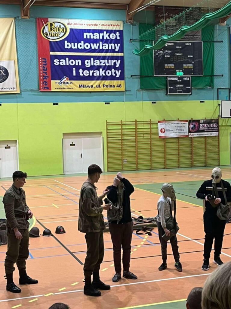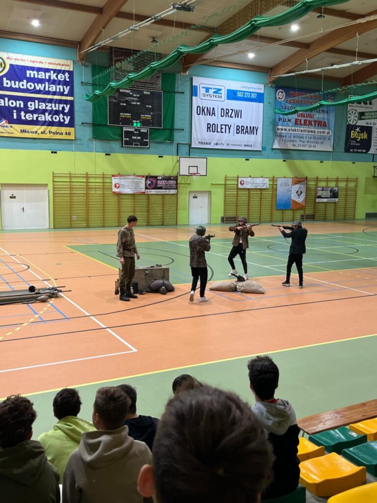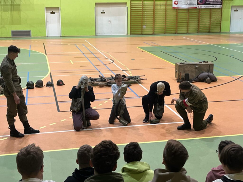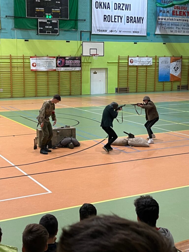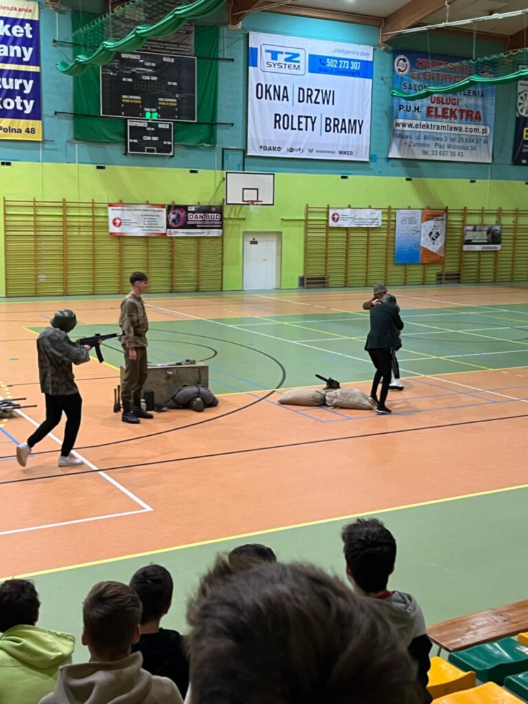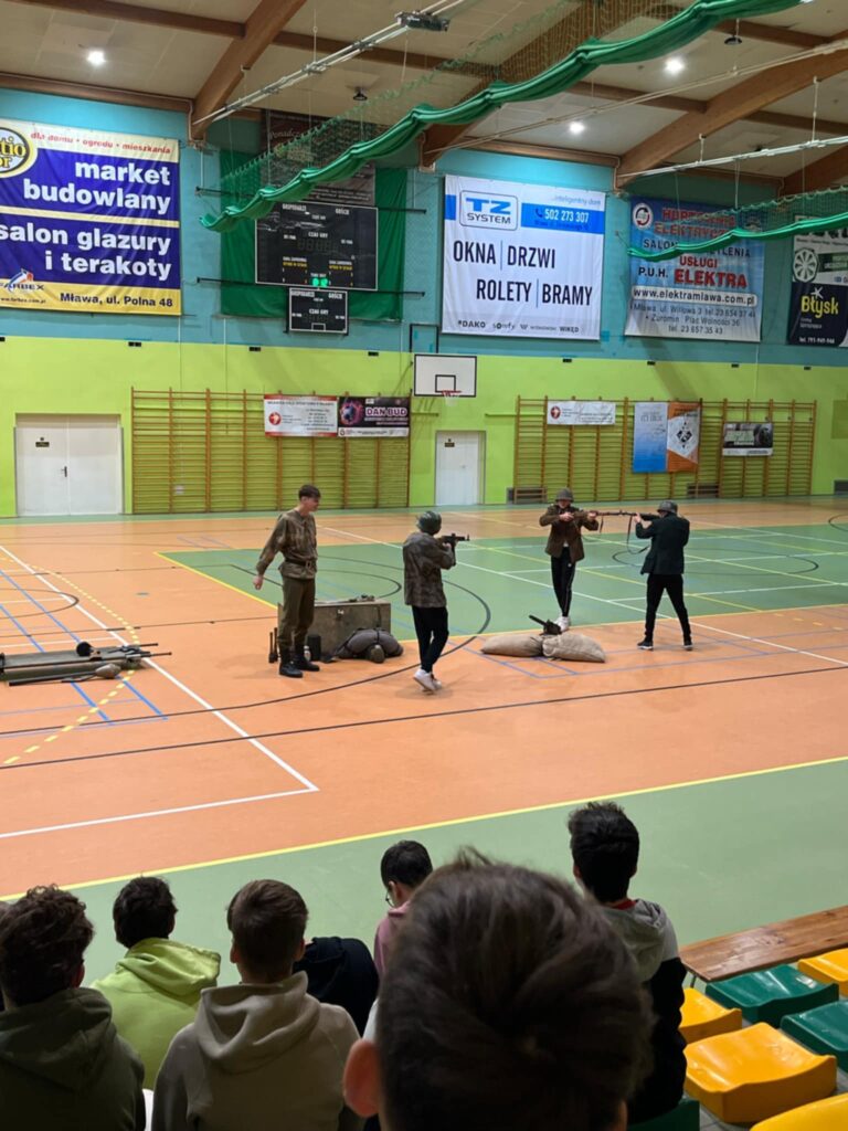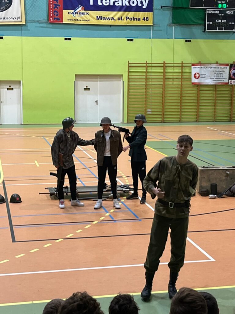 Przedstawienie było nie tylko wciągającą podróżą w czasie, ale także cenną lekcją patriotyzmu i refleksji nad trudną historią naszego kraju. Uczniowie mogli zobaczyć rekonstrukcję wydarzeń z okresu II wojny światowej, w tym codzienność żołnierzy, ich wyposażenie, uzbrojenie oraz realia walk ulicznych. Członkowie grupy rekonstrukcyjnej z niezwykłą dbałością o szczegóły zaprezentowali historyczne stroje, repliki broni oraz elementy wojskowego ekwipunku.