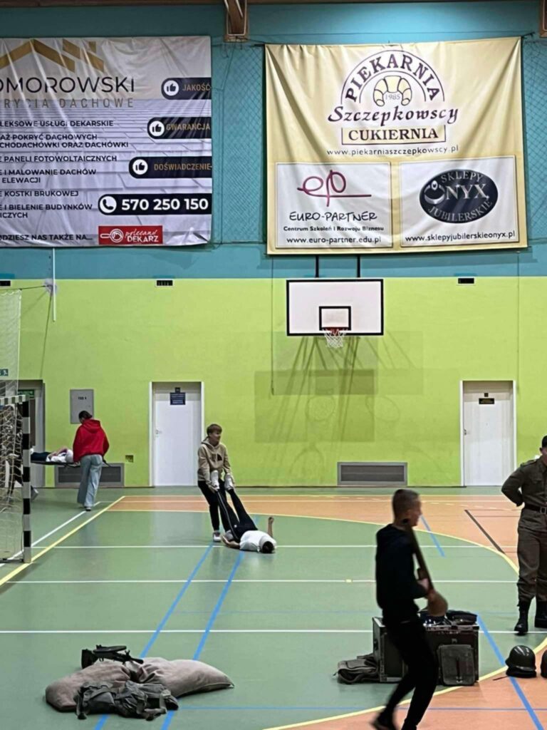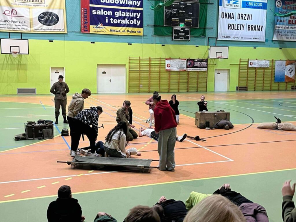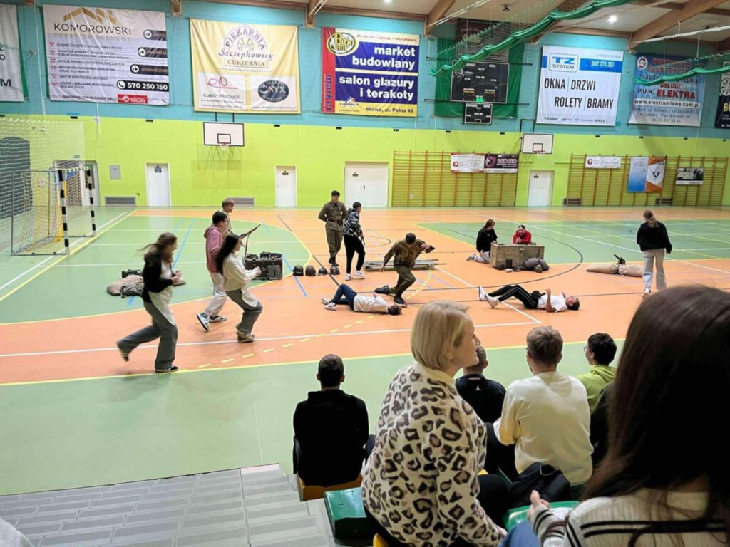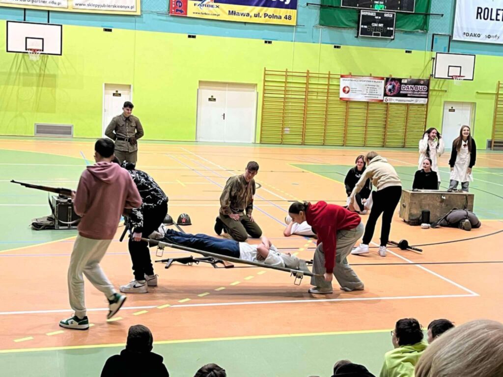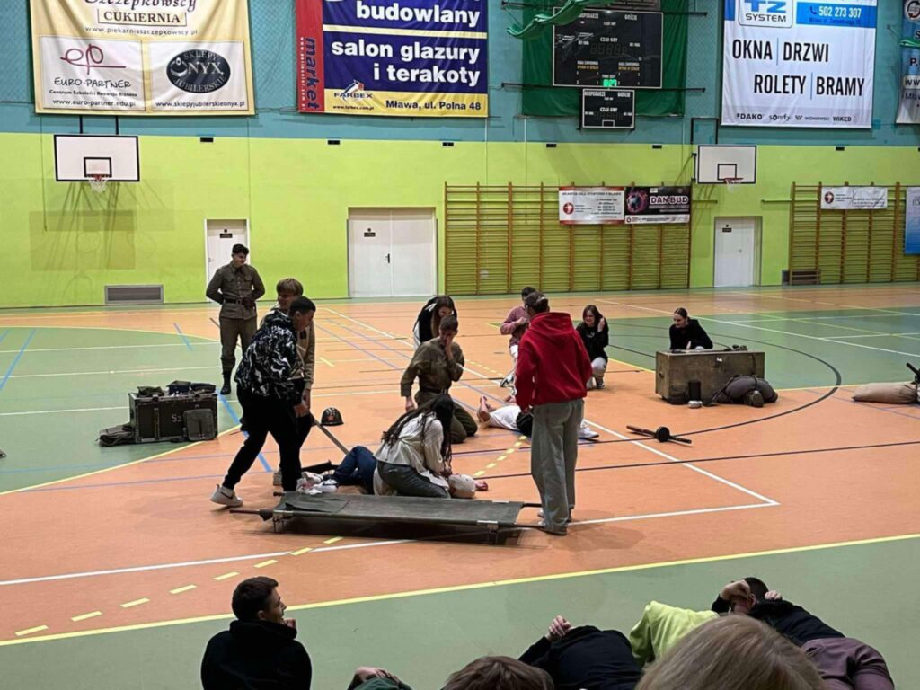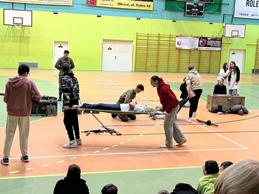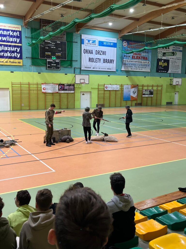 Przedstawienie było nie tylko wciągającą podróżą w czasie, ale także cenną lekcją patriotyzmu i refleksji nad trudną historią naszego kraju. Uczniowie mogli zobaczyć rekonstrukcję wydarzeń z okresu II wojny światowej, w tym codzienność żołnierzy, ich wyposażenie, uzbrojenie oraz realia walk ulicznych. Członkowie grupy rekonstrukcyjnej z niezwykłą dbałością o szczegóły zaprezentowali historyczne stroje, repliki broni oraz elementy wojskowego ekwipunku.