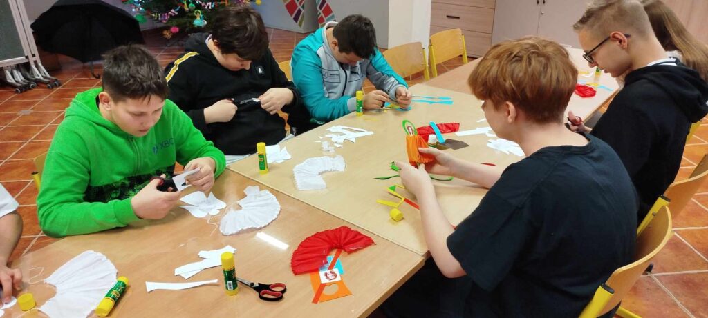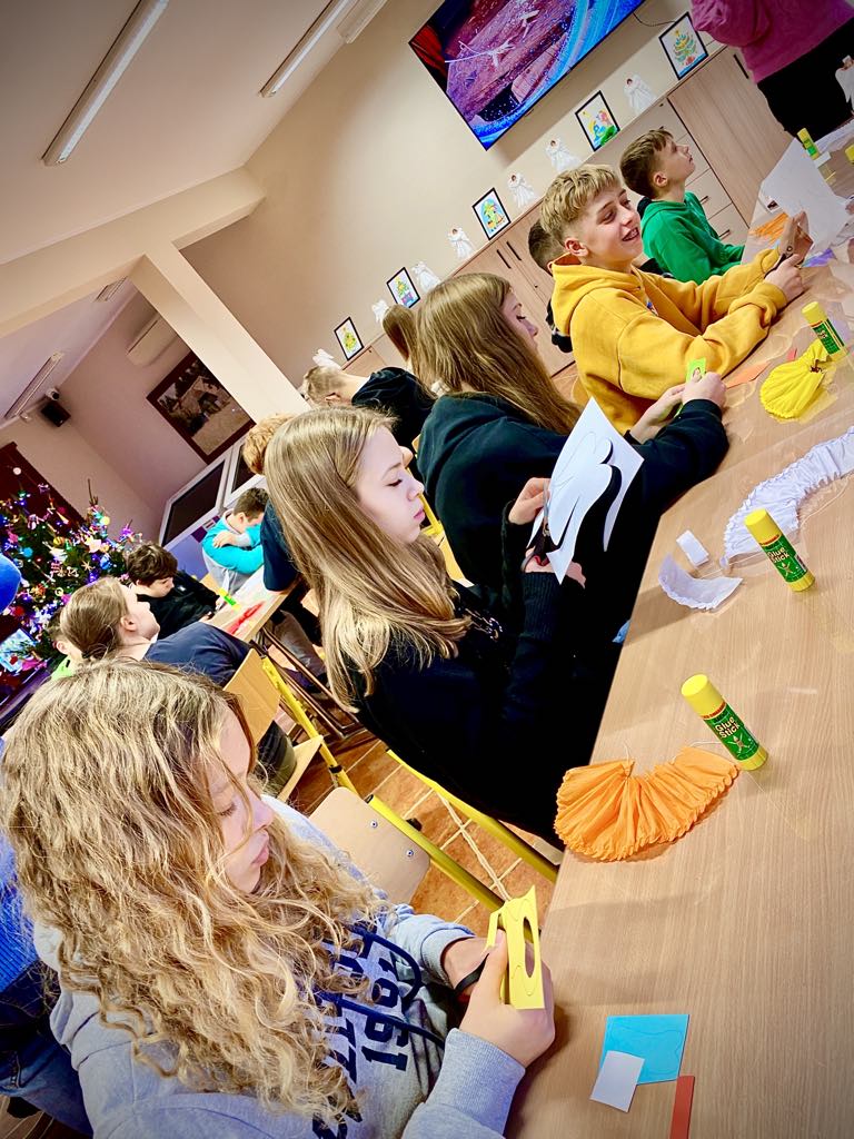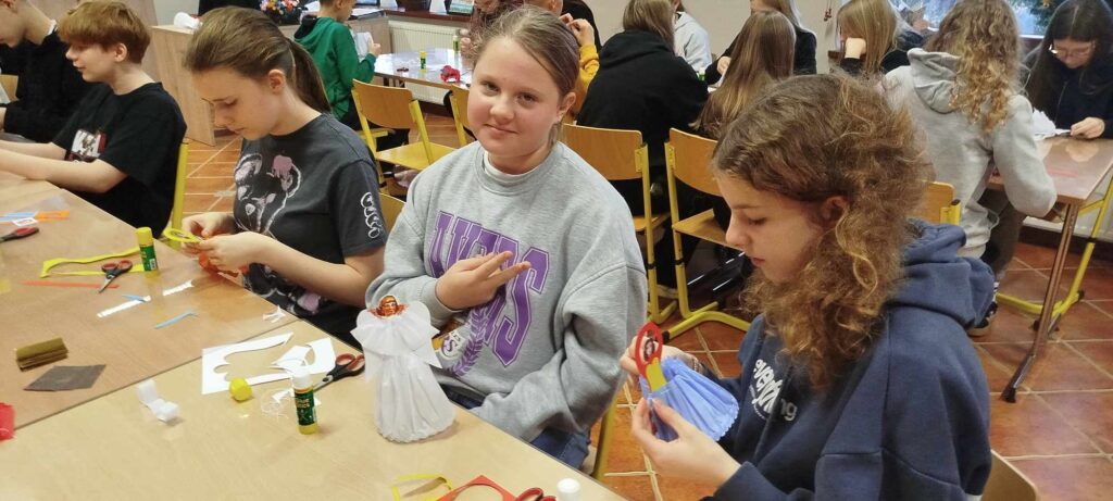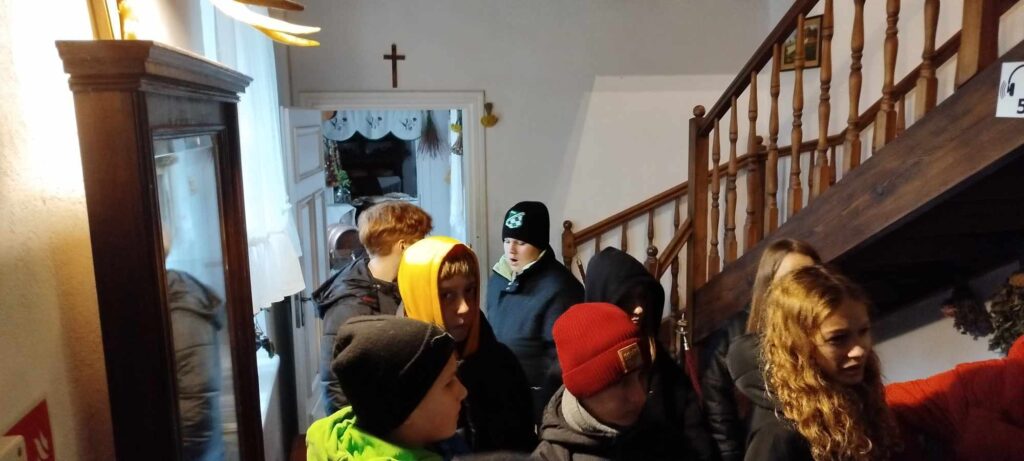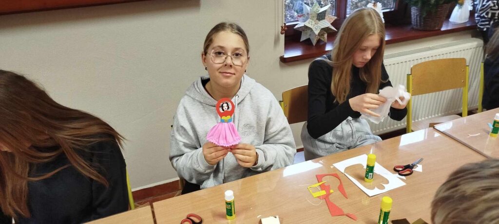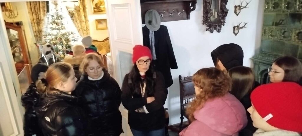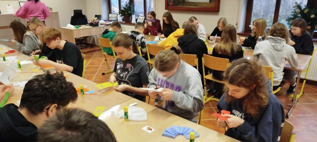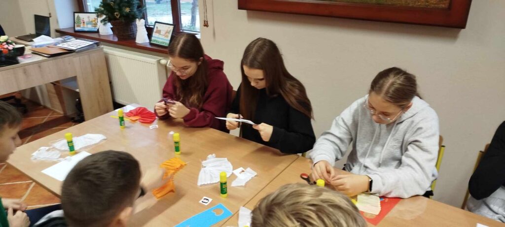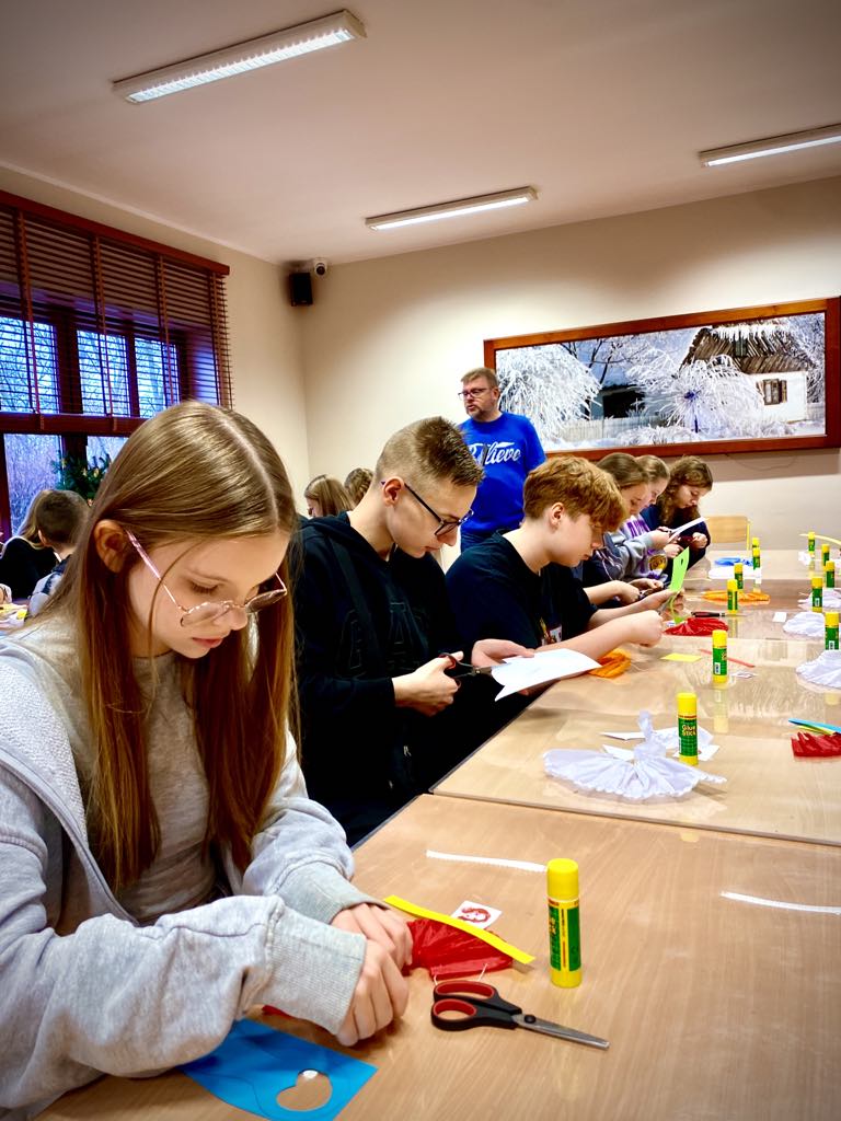 Jednym z najciekawszych elementów wycieczki były warsztaty ozdób choinkowych. Uczniowie mieli okazję samodzielnie wykonać tradycyjne ozdoby, które dawniej zdobiły wiejskie choinki. Warsztaty były nie tylko okazją do twórczej zabawy, ale również do poznania dawnych zwyczajów bożonarodzeniowych.