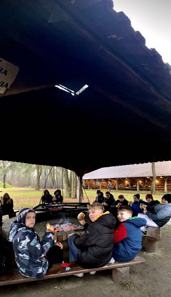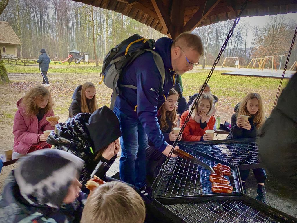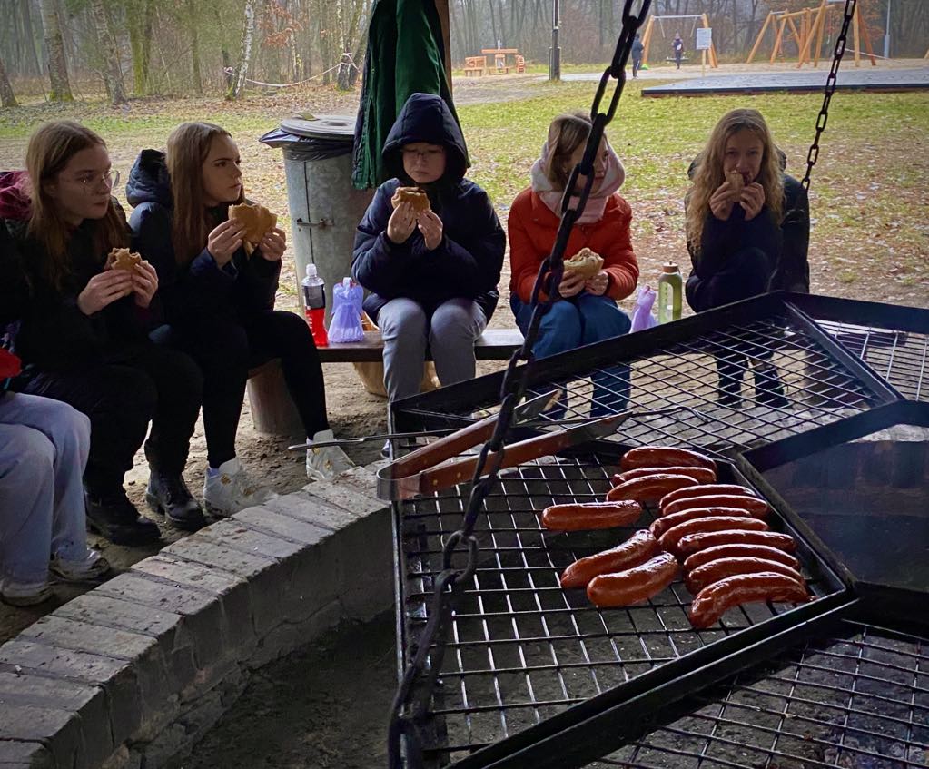 Na zakończenie dnia uczniowie wspólnie zjedli posiłek na świeżym powietrzu – pieczone na grillu kiełbaski. Ten moment, pełen radości i śmiechu, był doskonałą okazją do podsumowania całej wycieczki i podzielenia się wrażeniami.