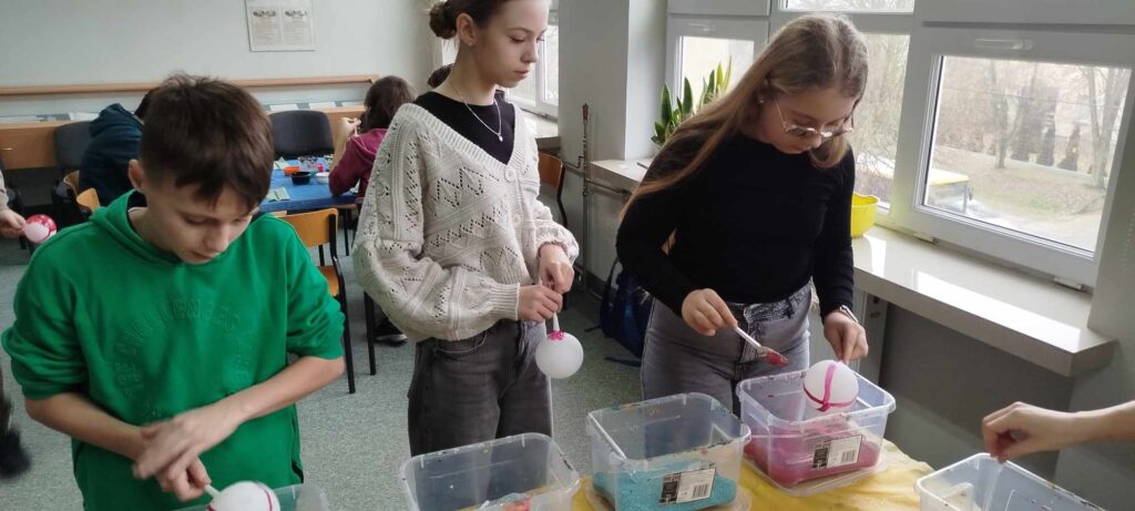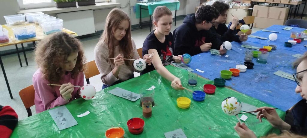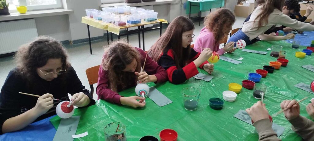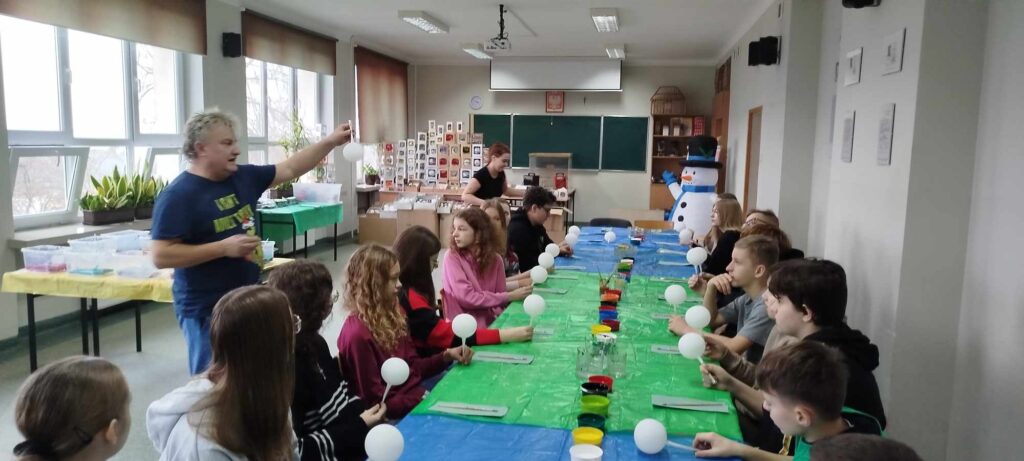 Warsztaty nie tylko dostarczyły uczniom dużo radości, ale także nauczyły ich precyzji i cierpliwości. Zdobienie szklanych bombek wymagało skupienia i delikatności, a efekty pracy przyniosły wiele satysfakcji. Po zakończonych warsztatach, gotowe bombki ozdobiły szkolną choinkę, nadając jej wyjątkowy, ręcznie wykonany charakter.