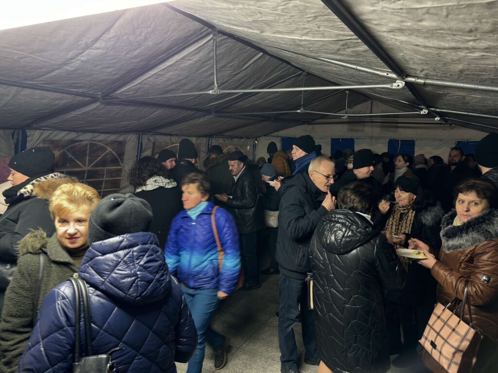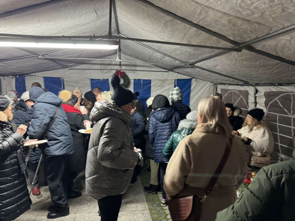 Kolejnym punktem programu była Wigilia Miejska, która zgromadziła mieszkańców przy wspólnym stole. Przygotowano tradycyjne potrawy wigilijne – barszcz z uszkami, pierogi, ryby i różnorodne sałatki – które cieszyły się dużym zainteresowaniem. Wszyscy uczestnicy, niezależnie od wieku czy statusu, spędzali czas w przyjaznej atmosferze, sprzyjającej rozmowom i delektując się przysmakami.