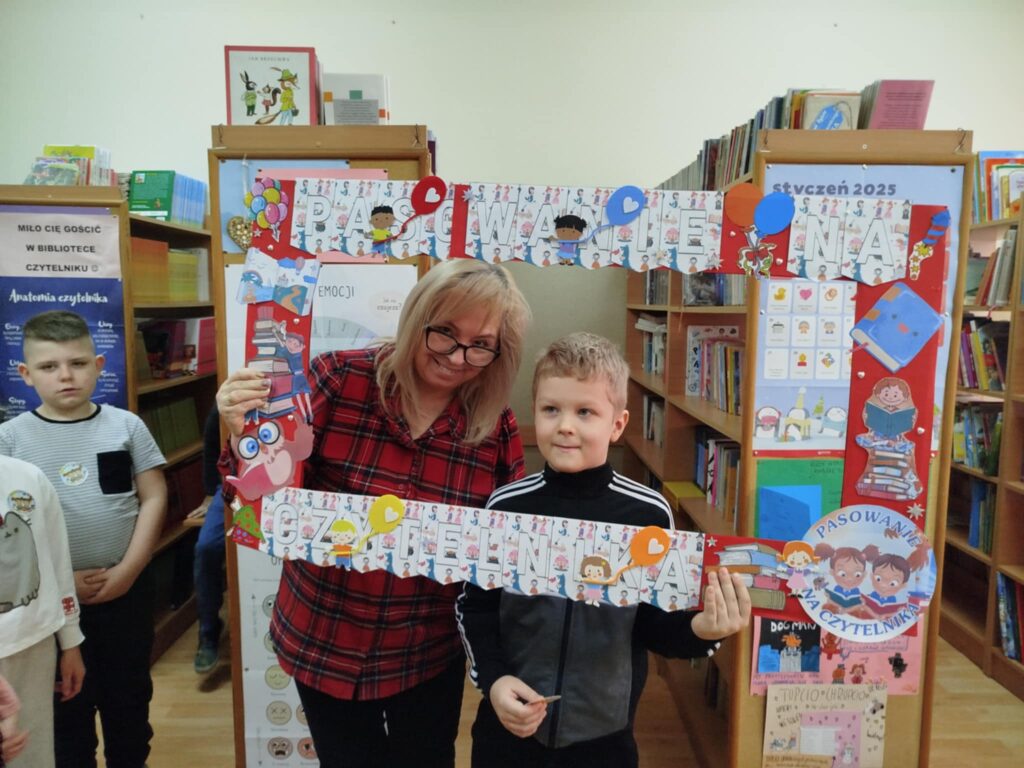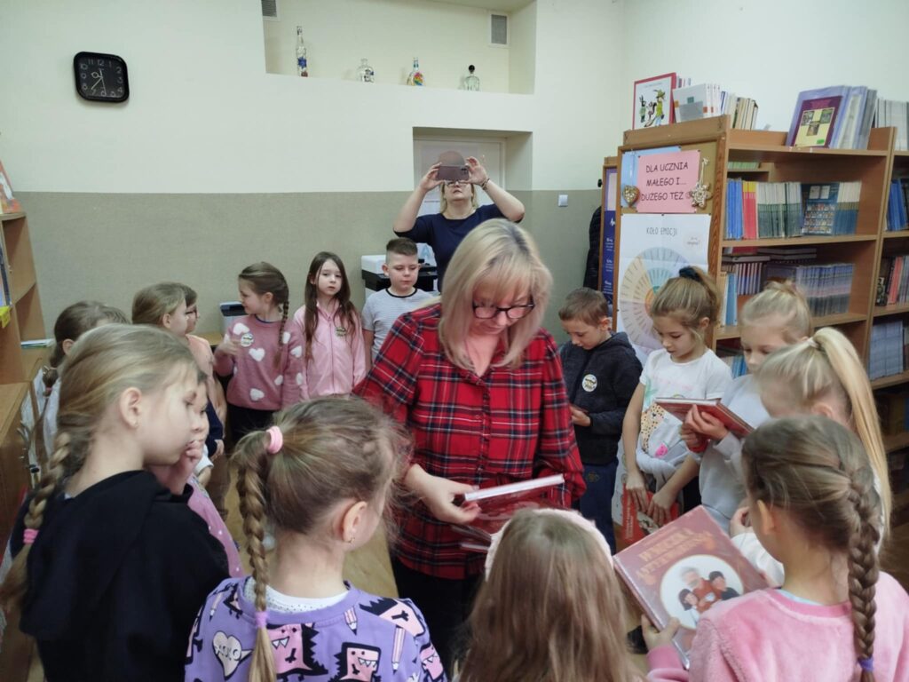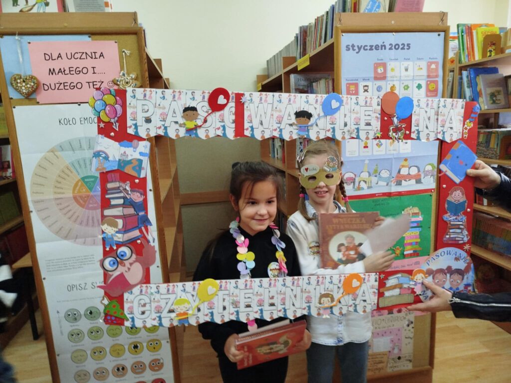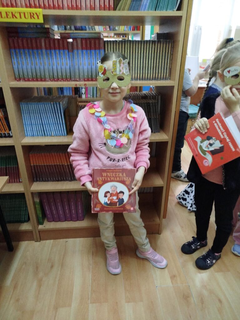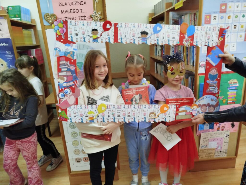 Kulminacyjnym momentem było uroczyste przyjęcie pierwszoklasistów w poczet czytelników i wręczenie im wyprawki czytelniczej – książki „Wnuczka antykwariusza” i przewodnika dla rodziców zachęcającego do czytania razem z dzieckiem. Uczniowie otrzymali kolorowanki, które gotowe zwrócą do biblioteki przy pierwszym wypożyczeniu książki. Były też wspólne zdjęcia w ramce upamiętniającej uroczystość.