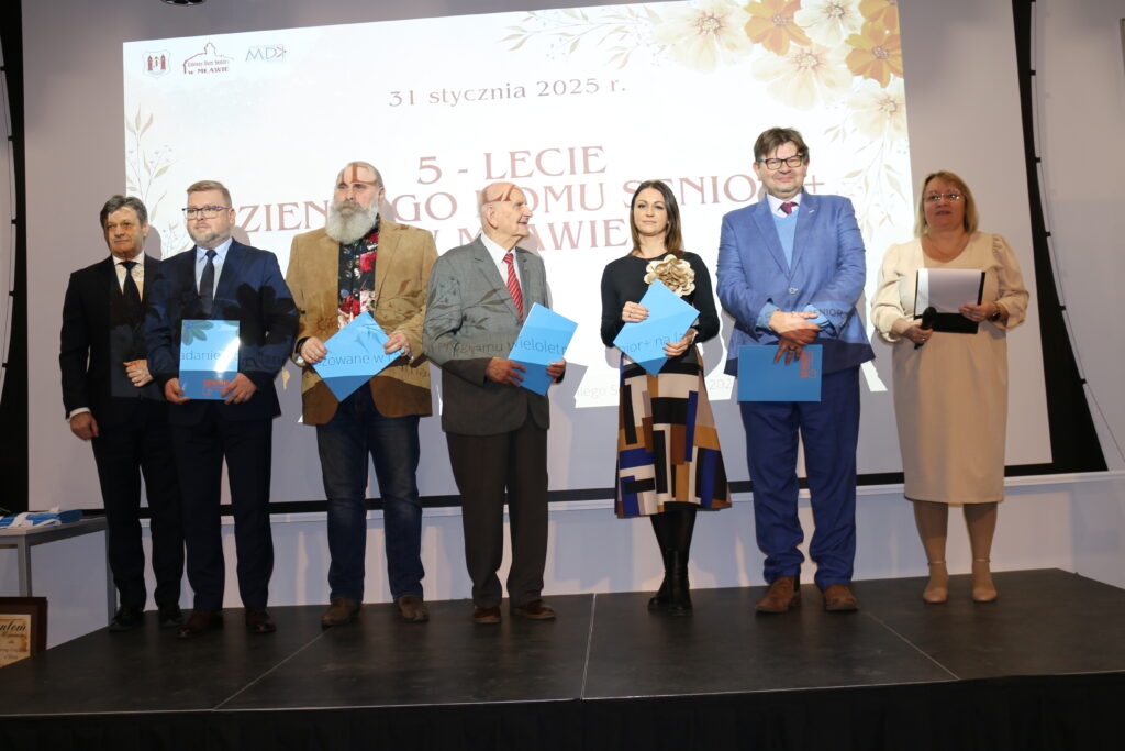 Dzienny Dom Senior + w Mławie działa już pięć lat! Ten piękny jubileusz instytucja świętowała w piątek 31 stycznia 2025 r. Podczas uroczystości w Miejskim Domu Kultury w Mławie nie brakowało wzruszających chwil.Podziękowania za dotychczasową pracę, poświęcenie i życzliwość oraz życzenia dalszej owocnej działalności i satysfakcji z podejmowanych przedsięwzięć złożyli na ręce Kierownik Dziennego Domu Senior + w Mławie Barbary Żurawińskiej przedstawiciele władz lokalnych oraz parlamentu. W imieniu Miasta Mława winszowali Pani Kierownik Zastępca Burmistrza Miasta Mława Mariusz Szczechowicz, Skarbnik Miasta Mława Beata Karpińska i Przewodniczący Rady Miasta Filip Kowalczyk. Następnie podziękowania od Barbary Żurawińskiej i władz miasta odebrali pracownicy Dziennego Domu Senior + oraz osoby – w tym przedstawiciele instytucji – którzy swoimi życzliwością, zaangażowaniem i pomocą wnieśli znaczący wkład w działalność świętującej jubileusz placówki.Licznie zgromadzeni w Sali na Dachu Miejskiego Domu Kultury goście obejrzeli bogatą w zdjęcia i materiały filmowe prezentację multimedialną dokumentującą 5 lat domu seniora, którego podopieczni i przedstawiciele ich rodzin dzielili się przed kamerami swoimi refleksjami na temat jubilata. Nie mogło oczywiście zabraknąć wzruszającego programu artystycznego w wykonaniu seniorów. Na koniec gospodarze zaprosili wszystkich obecnych na smaczny posiłek.Obchody pięciolecia Dziennego Domu Senior + w Mławie objął swoim patronatem Burmistrz Miasta Mława.Przypomnijmy, że Dzienny Dom Senior + w Mławie jest placówką wsparcia, w której nieaktywni zawodowo mieszkańcy miasta w wieku 60+ mają możliwość aktywnego spędzenia czasu. Placówka przyczynia się do poprawy jakości życia seniorów, oferując im przestrzeń do codziennego wsparcia, aktywizacji i integracji poprzez świadczenie usług: socjalnych, w tym gorącego posiłku; edukacyjnych; rehabilitacyjnych; terapii zajęciowej