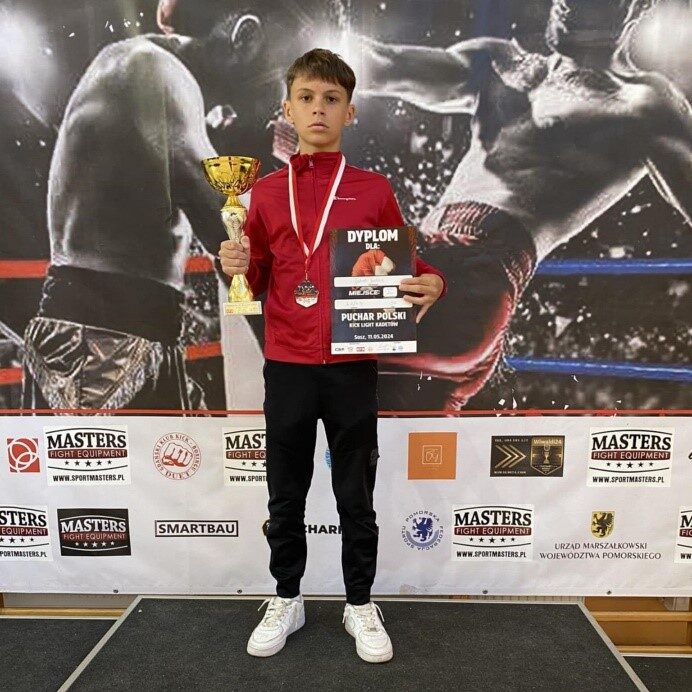 Zdobywca Pucharu Polski w kickboxing w wersji kick light, Susz 11.05.2024 r., organizator: PZKB i DFN, Dueat Gdańsk, Piechotka Team;
