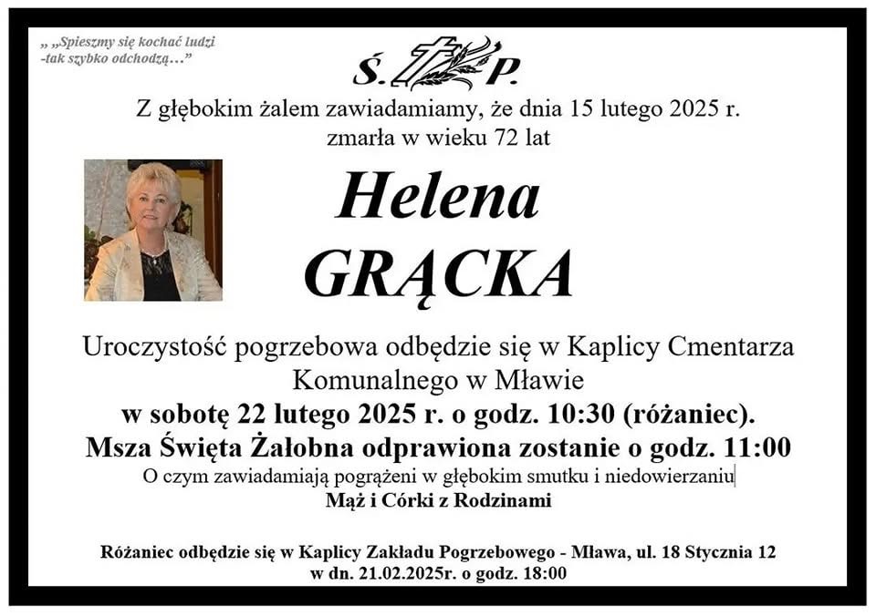 Pogrzeb Heleny Grąckiej odbędzie się w sobotę 22 lutego 2025 r. o godz. 11:00 w kaplicy na cmentarzu komunalnym w Mławie (msza św. żałobna będzie poprzedzona modlitwą różańcową o godz. 10:30).