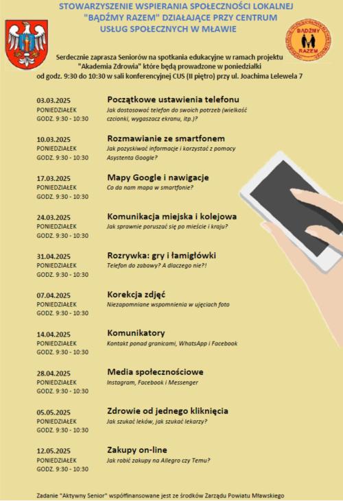 Stowarzyszenie Wspierania Społeczności Lokalnej “Bądźmy Razem” działające przy Centrum Usług Społecznych zaprasza wszystkich seniorów na spotkania edukacyjne w ramach projektu “Akademia Zdrowia” w marcowe, kwietniowe i majowe poniedziałki.