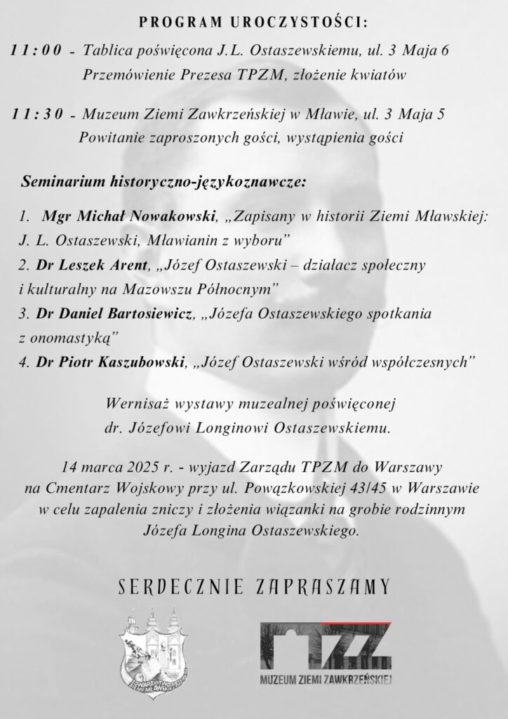 Muzeum Ziemi Zawkrzeńskiej w Mławie oraz Towarzystwo Przyjaciół Ziemi Mławskiej serdecznie zapraszają 15 marca 2025 roku o godzinie 11:00 na uroczystą inaugurację Roku dr. Józefa Longina Ostaszewskiego, organizowaną z okazji 150. rocznicy jego urodzin.