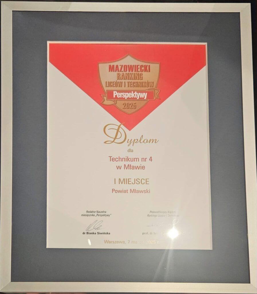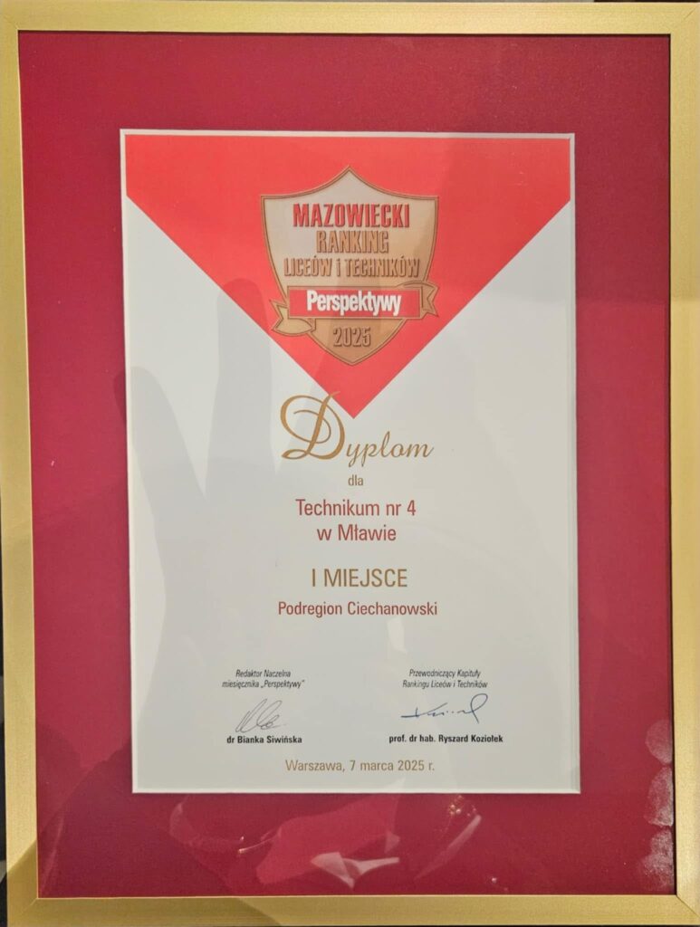 To niewątpliwie wielki sukces i wyróżnienie na tle placówek oświatowych. Technikum nr 4 w Mławie (w Zespół Szkół nr 4 w Mławie im. Obrońców Mławy z Września 1939 r.) zajęło I miejsce w podregionie ciechanowskim oraz I miejsce w powiecie mławskim (wśród techników) w Mazowieckim Rankingu Liceów i Techników. Plebiscyt zorganizowany był w ramach Rankingu Liceów i Techników Perspektywy 2025.